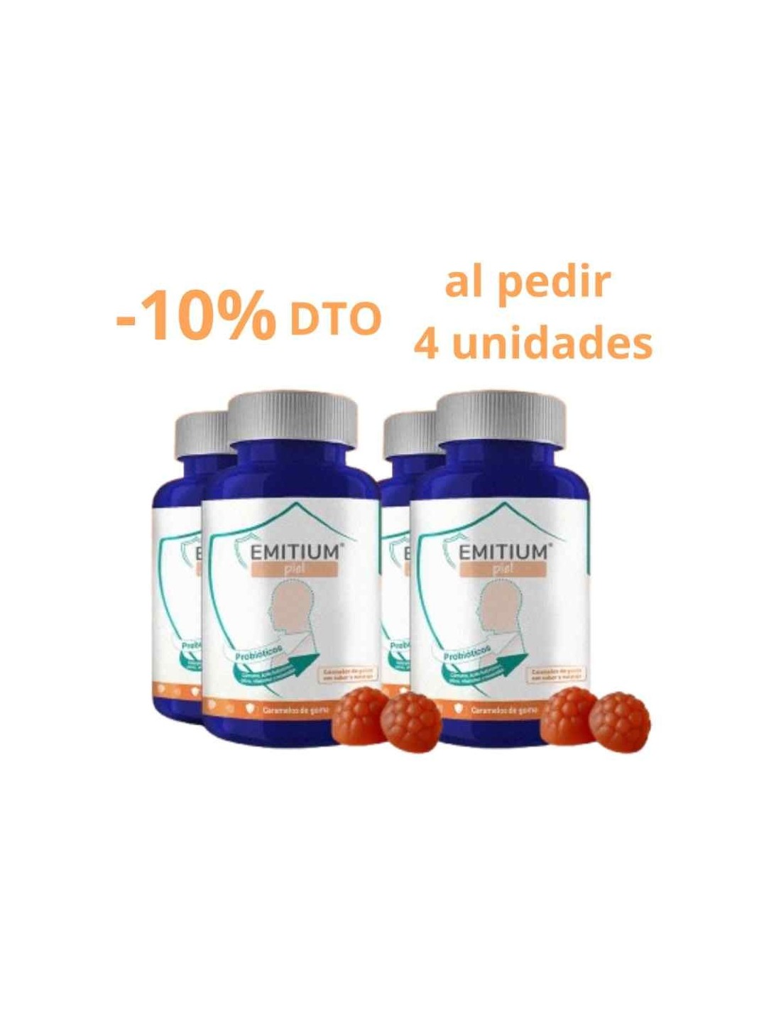 Cuidar la piel desde el interior Sabrosas gominolas naturales para el cuidado de la piel El verdadero secreto para una piel sana es mantenerla bien nutrida. EMITIUM® Piel es un complemento alimenticio en formato gominola que ayuda a mantener la piel sana gracias a sus ingredientes naturales. Formulado a base de cúrcuma y ácido hialurónico, que te ayudarán a mantener la piel nutrida. También contiene probióticos, extracto de olivo, vitaminas A, C, D, E, biotina, Cobre, Selenio y Zinc. El mejor suplemento para introducir en una rutina de cuidado de pieles sensibles, debilitadas o secas. EMITIUM® Piel es un complemento alimenticio en formato gominola formulado específicamente para cuidar tu piel desde el interior, favoreciendo su hidratación, reparación y descanso. Está diseñado para todo tipo de pieles, tanto de hombres como de mujeres. Contiene ácido hialurónico, que es un componente natural de la piel. Esta molécula aporta hidratación, elasticidad y firmeza. Su absorción es más efectiva desde el interior y nuestro organismo ve disminuida su producción a partir de los 30 años. Incluye un extracto de cúrcuma patentado, con una alta biodisponibilidad o capacidad de absorción, que tiene propiedades antioxidantes y que favorece la salud de la piel y del sistema inmunitario. Aporta Vitaminas A, C, D, E, biotina, Cobre, Selenio y Zinc, con beneficios adicionales para una nutrición óptima de la piel. Contiene un probiótico tindalizado con diversos estudios que demuestran la mejoría en la microbiota de la piel.* También aporta extracto de olivo, rico en polifenoles como el hidroxitirosol, que ha demostrado en múltiples estudios, que protege la piel del estrés oxidativo y del fotoenvejecimiento causado por la luz azul de los dispositivos electrónicos.* INGREDIENTES: EMITIUM® Piel tiene la siguiente composición: Ácido hialurónico. Extracto de cúrcuma. Probióticos a base de cepas tindalizadas Extracto de olivo Vitamina A, vitamina C, vitamina D, vitamina E, biotina, Cobre, Selenio y Zinc. Ingredientes: jarabe de glucosa, azúcar, agua, ácido L-ascórbico (vitamina C), Cursol® [extracto seco de Cúrcuma (Curcuma longa raíz)], gelificante (pectina), acidulante (ácido cítrico), extracto seco de olivo (Olea europea, fruto, 20% hidroxitol), maltodextrina, corrector de acidez (citrato trisódico), agente de recubrimiento (aceite vegetal de coco), acetato de retinilo (vitamina A), hialuronato de sodio (89% ácido hialurónico), cepa bacteriana (Lactobacillus plantarum UN-06), acetato de DL-alfa-tocoferilo (vitamina E), citrato de zinc, colorante (extracto de pimentón), aroma (aroma natural), ergocalciferol (vitamina D), sulfato cúprico, agente de recubrimiento (cera carnaúba), D-Biotina (biotina) y selenito de sodio. CONSEJOS DE USO: Se recomienda ingerir 2 gominolas al día para adultos y niños mayores de 12 años, y 1 gominola al día para niños mayores de 4 años. No recomendamos consumir más de 3 al día. PRESENTACIÓN:BOTE DE 60 GOMINOLAS Los complementos alimenticios no deben utilizarse como sustitutos de una dieta variada y equilibrada y de un estilo de vida saludable. No superar la dosis diaria expresamente recomendada. No recomendado en caso de hipersensibilidad o alergia a cualquiera de los componentes de la formulación. No deben ingerirse cantidades diarias superiores a 9 g de FOS/día. Un consumo excesivo puede causar malestar intestinal. Evitar el consumo junto con medicamentos y otros complementos alimenticios a base de fibra. Mantener fuera del alcance de los niños más pequeños. Conservar en un lugar fresco y seco, protegido de la luz solar y las fuentes de calor. Contiene azúcares naturalmente presentes. La información contenida en nuestra web tiene carácter informativo y no puede ser considerada como sustitutiva de la prescripción, diagnóstico o tratamiento médico. Los resultados de los complementos nutricionales pueden variar en función de la persona, y el tiempo para obtener los beneficios indicados dependerá de cada caso.