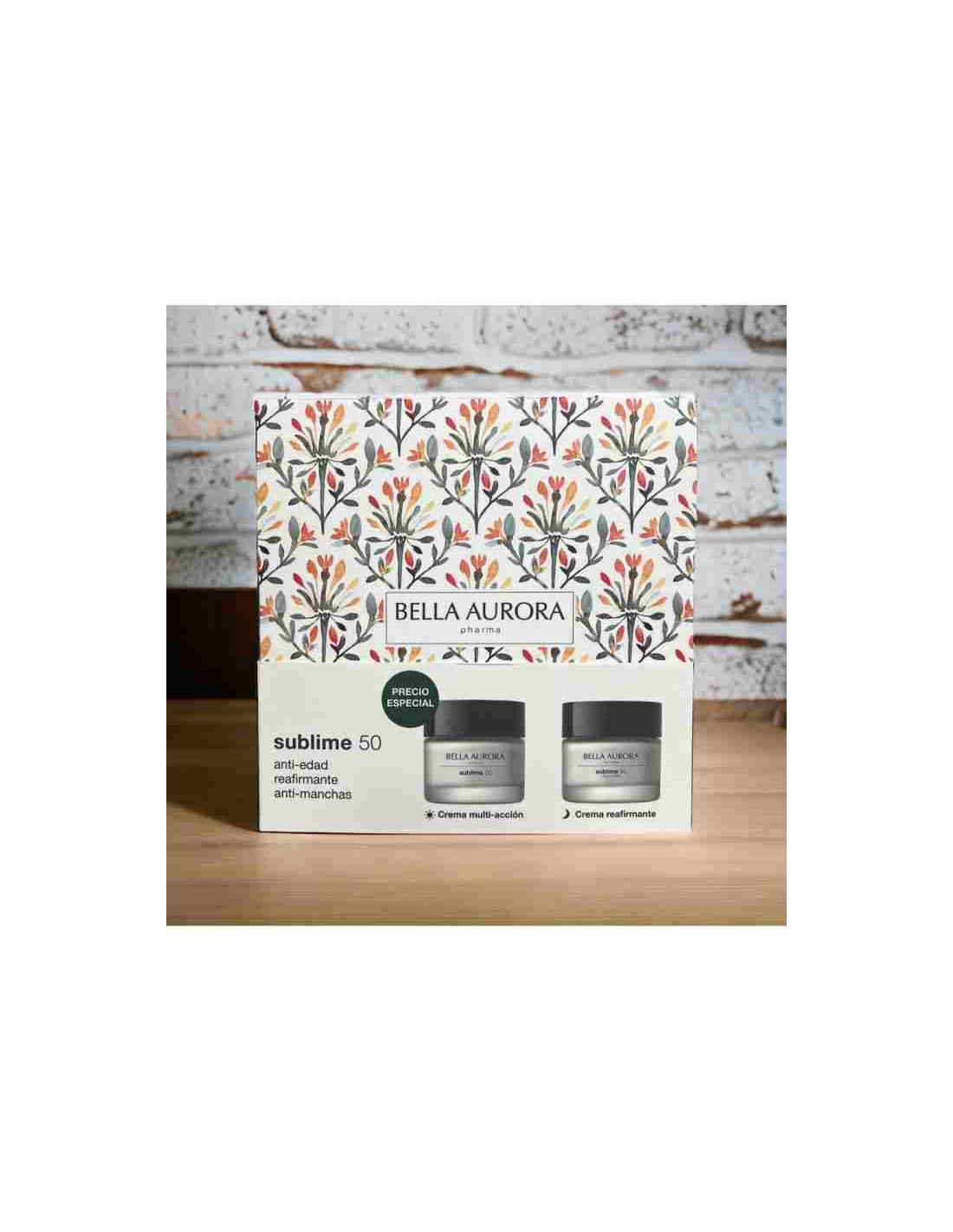 PACK BELLA AURORA SUBLIME +50 AÑOS Sublime Crema Anti-edad Día Fortalece la piel favoreciendo la adhesión de la microbiota beneficiosa. Atenúa las manchas oscuras. Unifica el tono. Ilumina el rostro apagado y fatigado. Redensifica la piel a través de la síntesis de ácido hialurónico. Mantiene la piel hidratada. PRESENTACIÓN: envase de 50 ml Sublime Crema Reafirmante Noche Formulada con perla negra de Tahití que ejerce una función regeneradora durante la noche. Remodela el contorno del óvalo facial. Evita el descolgamiento de los tejidos del rostro, cuello y escote. Proporciona una mayor elasticidad a los tejidos con efecto lifting. PRESENTACIÓN: envase de 50 ml