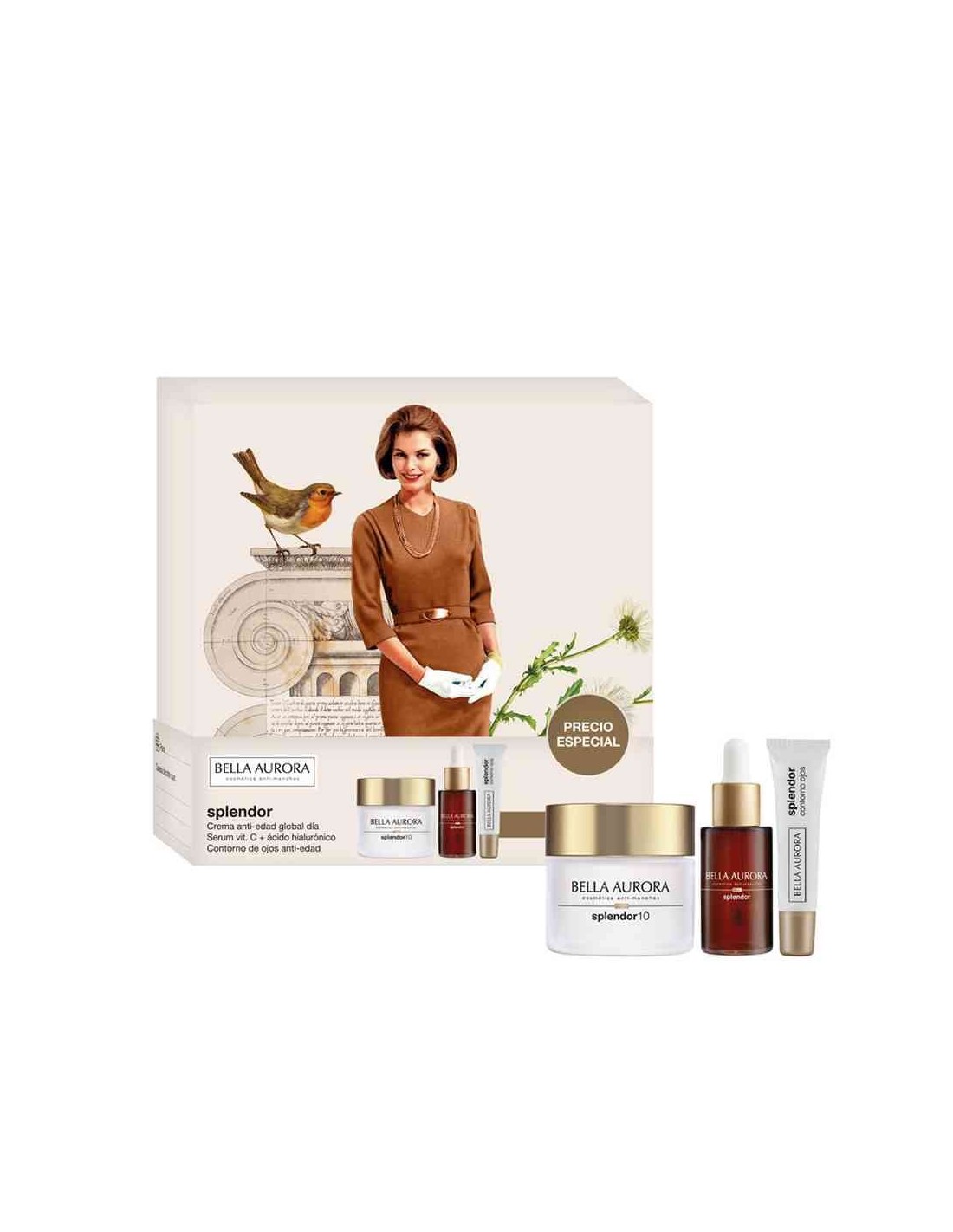 El pack Splendor , Sérum y Contorno de Ojos es un tratamiento antiedad que aporta luminosidad y firmeza. Incluye crema de día, sérum iluminador y contorno de ojos. Ideal para una piel joven y radiante las 24 horas. Perfecto para regalar y brillar en Navidad. Splendor Crema Antiedad de Día Este tratamiento antiedad avanzado actúa sobre los 10 signos del envejecimiento con tecnología epigenética. Con un booster de colágeno, reduce arrugas, reafirma el óvalo facial y combate manchas, devolviendo luminosidad y uniformidad. Con SPF 20, protege de daños solares y envejecimiento prematuro. 50 ml Splendor Sérum Tratamiento con ácido hialurónico y vitamina C de acción antioxidante. Hidrata intensamente, previene el envejecimiento prematuro y reduce arrugas y líneas de expresión. 30 ml Splendor Contorno de Ojos Antiedad Tratamiento para el contorno de ojos y comisura de labios que combate arrugas, líneas de expresión, ojeras y bolsas. Con péptidos y ácido hialurónico, hidrata, tensa y redensifica la piel, devolviendo firmeza y juventud a la mirada. 15 ml