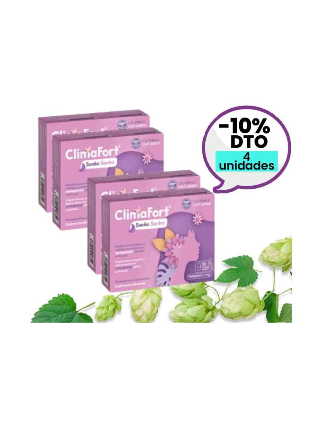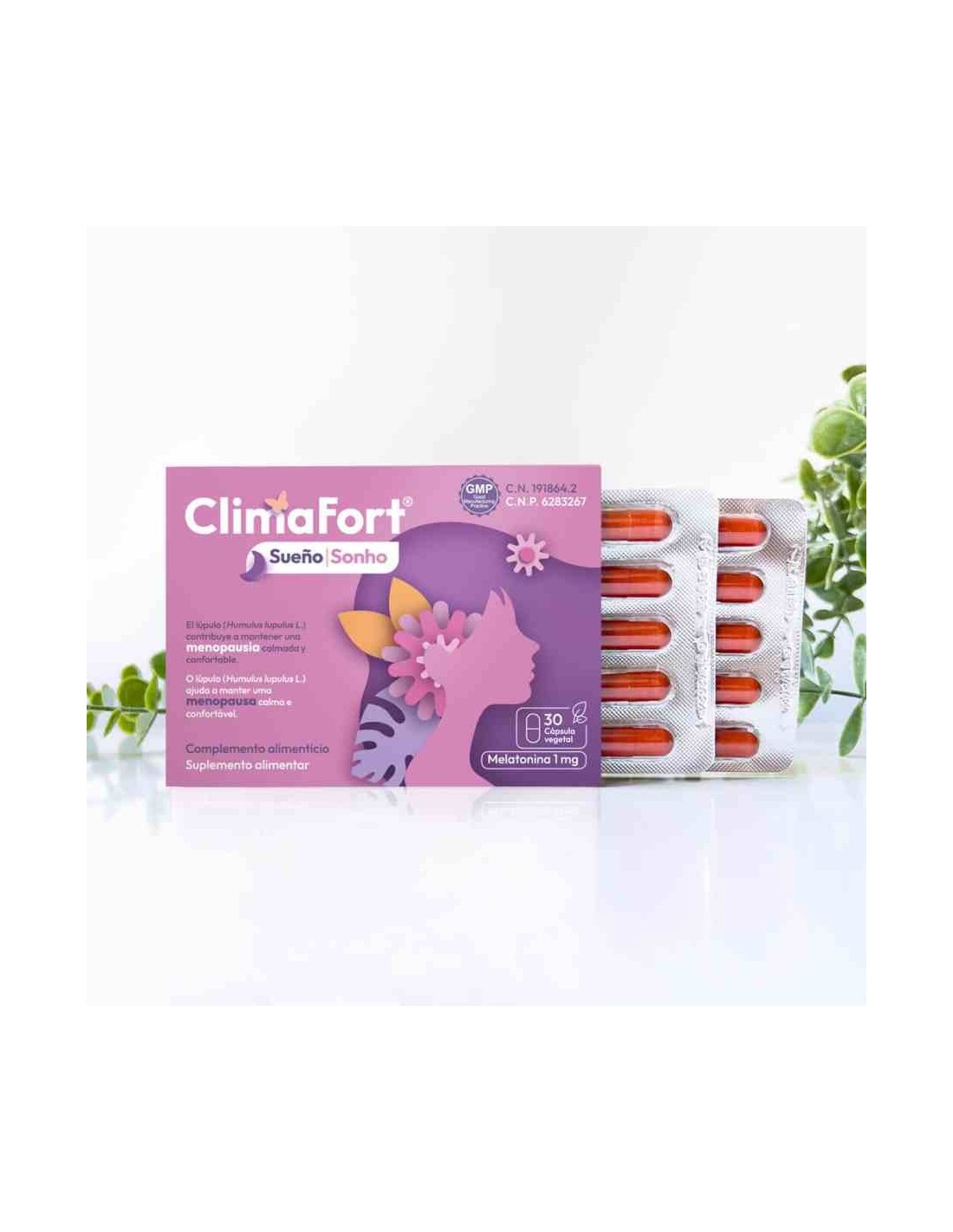 INDICACIONES ClimaFort® SUEÑO es un complemento alimenticio sin estrógenos ni isoflavonas de soja cuya fórmula contribuye a mejorar los síntomas de la menopausia como el alivio de los sofocos(1). Su fórmula mejorada ayuda a obtener un efecto beneficioso en el sueño al tomar una cápsula una hora antes de ir a dormir. La fórmula única de ClimaFort® SUEÑO se basa en el extracto seco de lúpulo (8PN), melatonina y otros nutrientes como Niacina, extracto seco de Melisa, Manganeso, Vitamina K2, Vitamina B5, Vitamina B6, Vitamina B2, Vitamina A, Selenio, Biotina, Vitamina D3 y Vitamina B12. Durante la menopausia el cuerpo experimenta una serie de cambios que afectan a la calidad de vida. Uno de los síntomas más molestos son lossofocos diurnos y nocturnos, que pueden llegar a provocar insomnio, fatiga e irritabilidad. ¿Cómo aliviar los sofocos de la menopausia? Disminuir la frecuencia e intensidad de los sofocos y conciliar un sueño más profundo y reparador son dos de los pasos que ayudan a las mujeres en la menopausia a encontrarse mejor y llevar una vida lo más saludable posible. La fórmula mejorada del nuevo ClimaFort® SUEÑO ayuda a aliviar los sofocos y a lograr un mejor descanso gracias a la 8-PN y contribuye a un efecto beneficioso en el sueño gracias a la toma de melatonina una hora antes de ir a dormir. ClimaFort® SUEÑO es un complemento alimenticio 100% natural y carece de efectos secundarios o interacciones. Sin gluten, sin lactosa, sin azúcar. No contiene isoflavonas de soja. Libre de estrógenos. INGREDIENTES: Extracto seco de lúpulo (8PN), Niacina, Extracto seco de Melisa, Zinc, Ácido Pantoténico, Manganeso, Vitamina B6, Riboflavina, Melatonina, Vitamina A, Biotina, Selenio, Vitamina K2, Vitamina D3 y Vitamina B12. ClimaFort® es un producto 100 % natural, libre de estrógenos e isoflavonas de soja. Sin lactosa, sin gluten y sin azúcar. CONSEJOS DE USO: El uso de ClimaFort SUEÑO® es muy sencillo: debes tomar una cápsula aproximadamente una hora antes de ir a dormir. PRESENTACION: envase de 30 capsulas