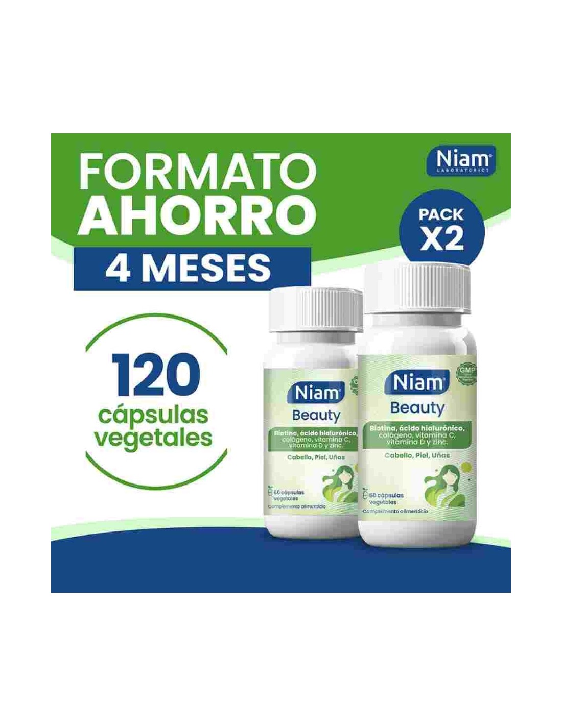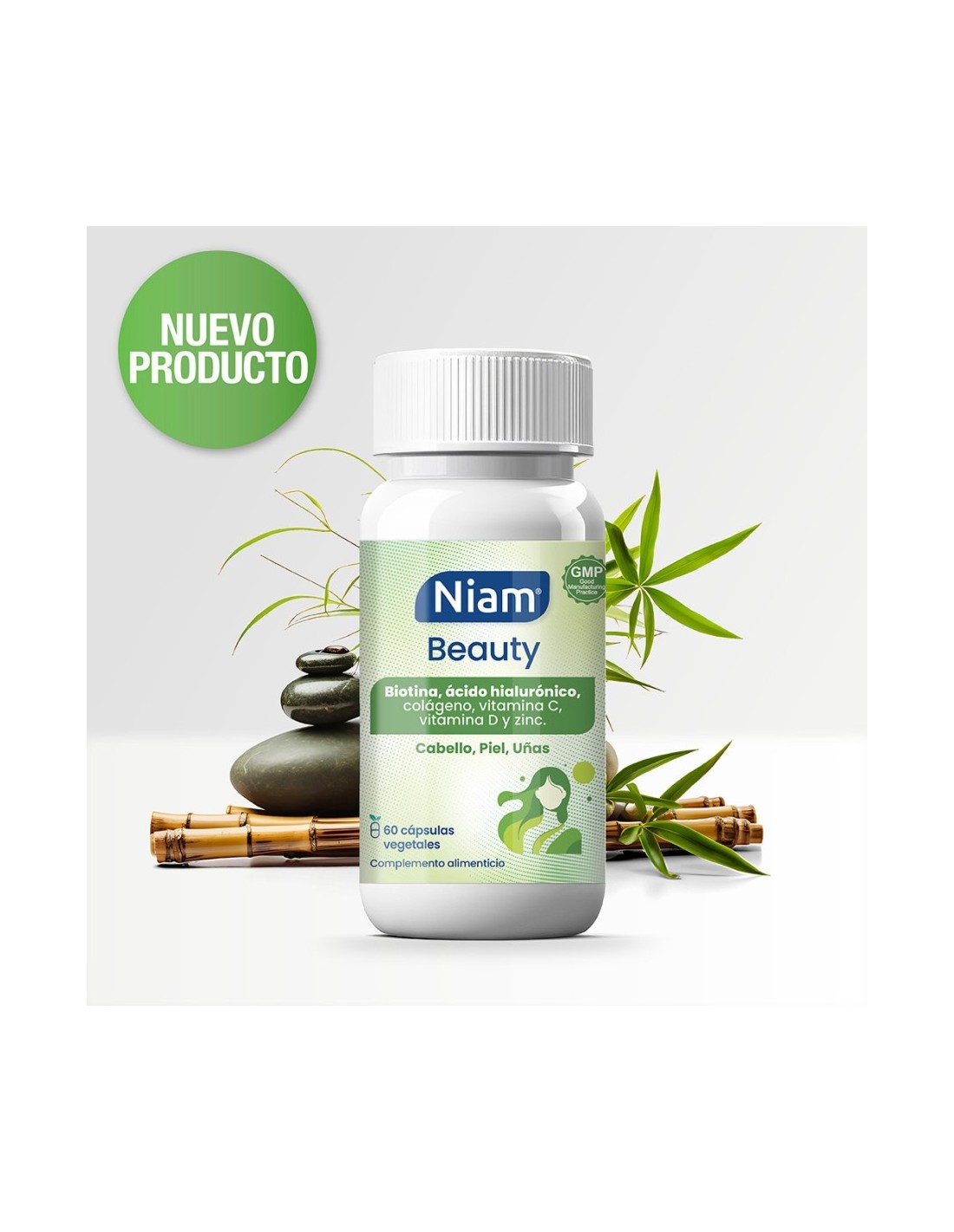 INDICACIONES Ciencia e innovación para tu cabello, piel y uñas Fórmula avanzada con Biotina y Ácido Hialurónico Niam® Beauty redefine el cuidado personal con una fórmula exclusiva que combina 2000 µg de biotina de alta potencia, colágeno hidrolizado tipo I de origen marino, ácido hialurónico de rápida absorción y extracto de bambú rico en silicio orgánico. Su formulación cuidadosamente equilibrada está diseñada para fortalecer profundamente tu cabello desde la raíz, reducir la caída y devolverle su brillo natural. Además, también hidrata intensamente la piel, mejora su elasticidad y refuerza la resistencia de las uñas. Enriquecida con vitaminas antioxidantes, cada cápsula concentra una poderosa combinación de ingredientes científicamente respaldados que trabajan en sinergia para ofrecer resultados visibles y sostenibles. Cabello más fuerte y resistente desde la raíz: con 2000 µg de biotina y colágeno hidrolizado tipo I de origen marino, esta fórmula avanzada está diseñada para fortalecer la estructura capilar, reducir la caída y estimular el crecimiento. El zinc optimiza el equilibrio del sebo en el cuero cabelludo, promoviendo un cabello saludable, brillante y voluminoso. El extracto de bambú, rico en silicio orgánico, aporta resistencia y nutrición, haciendo de Niam® Beauty un aliado único en el cuidado del cabello. Piel profundamente hidratada y elástica: el ácido hialurónico, reconocido por su capacidad para retener hasta 1000 veces su peso en agua, mejora la hidratación y elasticidad de la piel, mientras que la vitamina C impulsa la producción natural de colágeno para una firmeza renovada. La vitamina E refuerza la protección contra los radicales libres, previniendo los signos visibles del envejecimiento y manteniendo una piel suave y rejuvenecida. Uñas más fuertes y saludables: la sinergia de biotina, colágeno y zinc contribuye al fortalecimiento de las uñas, reduciendo su fragilidad y promoviendo un crecimiento constante y saludable. El silicio del extracto de bambú aporta resistencia adicional, ayudando a evitar roturas y descamaciones. Protección avanzada contra el envejecimiento celular: la potente acción antioxidante del selenio, las vitaminas C y E y el zinc protege las células del daño oxidativo, apoyando la regeneración de cabello, piel y uñas. Esta defensa integral ayuda a prevenir el envejecimiento prematuro y asegura una apariencia joven y vibrante. INGREDIENTES Biotina (2000 µg) Ácido hialurónico (95% ácido hialurónico ? 120 mg) Colágeno hidrolizado tipo I (100 mg) Extracto de bambú (7 mg) Zinc (6.5 mg) Selenio (45 µg) Vitamina C (30 mg) Vitamina E (12 mg a-TE) Vitamina D (5 µg) INGREDIETNES ACTIVOS por 1 cápsula: Hialuronato sódico (95% ácido hialurónico ? 120 mg), agente de recubrimiento (hidroxipropilmetilcelulosa), colágeno hidrolizado de PESCADO ? 100 mg, agente de carga (celulosa microcristalina), acetato de DL-alfa-tocoferilo (vitamina E ? 12 mg a-TE , 100% VRN*), gluconato de zinc (6.5 mg de zinc, 65% VRN*), ácido L-ascórbico (vitamina C ? 30 mg, 38% VRN*), extracto seco de bambú (Bambusa arundinacea, tronco ? 10 mg, 70% sílice ? 7 mg), antiaglomerante (sales magnésicas de ácidos grasos), L-seleniometionina (45 µg de selenio, 82% VRN*), antiaglomerante (dióxido de silicio), D-biotina (biotina ? 2000 µg, 4000% VRN*) y colecalciferol (vitamina D ? 5 µg, 100% VRN*). *VRN: Valores de Referencia de Nutrientes. MODO DE EMPLEO Tomar 1 cápsula al día, preferiblemente por la mañana con el desayuno para mejorar la absorción de los nutrientes. Recomendamos un mínimo de 3 meses de suplementación para obtener resultados óptimos en el cabello, piel y uñas. ADVERTENCIAS Los complementos alimenticios no deben utilizarse como sustitutos de una dieta variada y equilibrada y de un estilo de vida saludable. No superar la dosis diaria expresamente recomendada. No recomendado en caso de hipersensibilidad o alergia a cualquiera de los componentes de la formulación. Mantener fuera del alcance de los niños más pequeños. Conservar en un lugar fresco y seco, protegido de la luz solar y las fuentes de calor. La información contenida en nuestra web tiene carácter informativo y no puede ser considerada como sustitutiva de la prescripción, diagnóstico o tratamiento médico. Los resultados de los complementos nutricionales pueden variar en función de la persona, y el tiempo para obtener los beneficios indicados dependerá de cada caso.