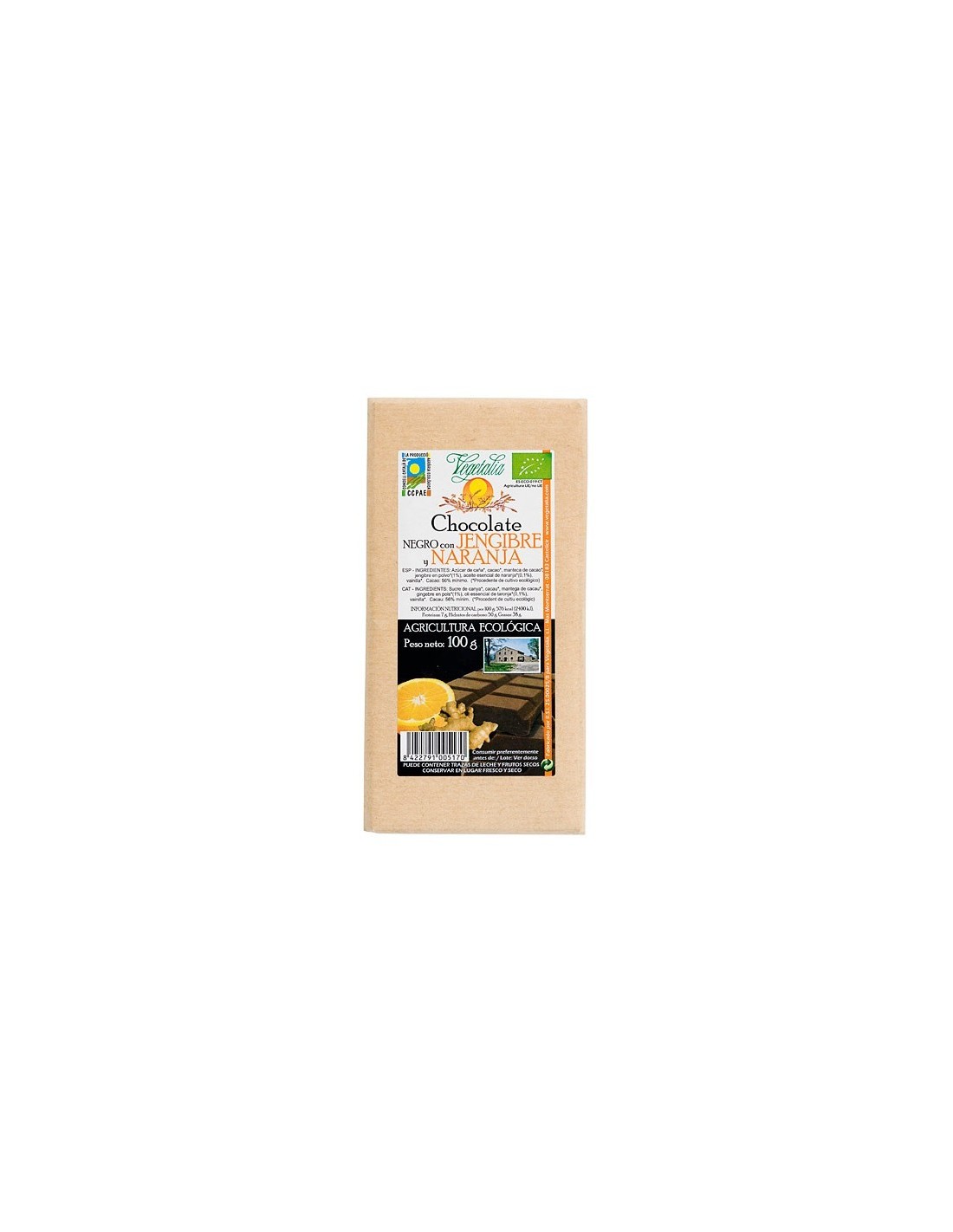 Azúcar de caña*, cacao*, manteca de cacao*, jengibre en polvo* (1%), aceite esencial de naranja* (0,1%), vainilla*, emulgente: lecitina de soja. (*de cultivo ecológico)