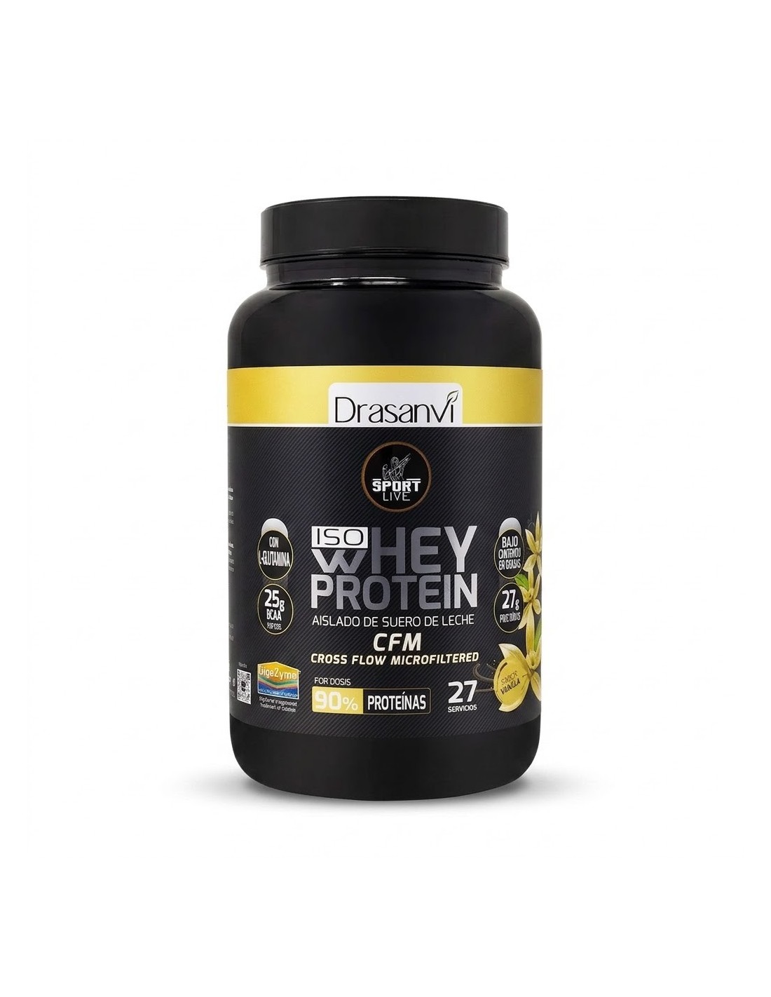 Whey Protein con sabor vainilla es un complemento alimenticio a base de proteínas de alta pureza. Esta fuente proteica proviene de aislado de suero de leche obtenido por microfiltración y ultrafiltrado.La calidad de nuestra proteína nos permite obtener un producto de alta concentración en proteínas (próximo al 90%), extremadamente bajo en hidratos de carbono y libre de grasas.Su alta pureza aporta gran cantidad de aminoácidos ramificados, presentes naturalmente en la proteína, así como otros aminoácidos esenciales y minerales como el calcio y el fósforo.Con el fin de mejorar la calidad del producto, hemos añadido aminoácidos como la Glutamina y la Leucina, y enzimas digestivas que ayudan a asimilar las proteinas. INGREDIENTES Aislado de proteína de suero de leche (Promiko 295 IP)(Contiene LECHE) (Contiene lecitina de SOJA como emulgente)27,33 g, Aroma(Aroma de vainilla), L-glutamina 0,4 g, L-leucina 0,4 g, Espesante(Goma xantana), Complejo de enzimas digestivas[alfa-amilasa (24000 DU/g), proteasa (6000 PC/g), celulasa (1100 CU/g), beta-D-galactosidasa (4000 ALU/g) y lipasa (200 FIP/g)]0,1 g, Edulcorante(Sucralosa), Colorante(Betacaroteno) CONSEJOS DE USO Tomar 30 g. (3/4 del cacito dosificador) disueltos en 250 ? 300 ml. de agua o leche semidesnatada. Generalmente, deben tomarse después del ejercicio. PRESENTACIÓN Envase de 800 g (28.22 oz) ADVERTENCIAS Complemento alimenticio a base de complejo de enzimas digestivas (alfa-amilasa, proteasa, celulasa, beta-D-galactosidasa y lipasa) proteina y aminoácidos con edulcorante Los complementos alimenticios no deben utilizarse como sustituto de una dieta equilibrada. No superar la dosis diaria expresamente recomendada. Mantener fuera del alcance de los niños más pequeños. Conservar en un lugar fresco y seco. Contiene leche y soja Valores nutricionales por cada 100 g Por 100 gPor dosis diarias Valor energético1580 KJ (376Kcal)474KJ (113 Kcal) Grasas<1 g<0,3 g De los cuales saturadas<0,05 g<0,02 g Hidratos de carbono0,75 g0,23 g De las cuales azúcares<0,5 g<0,2 g Proteínas91,1 g27,3 g Sal<0,1 g<0,1 g Aminograma AMINOÁCIDOS100 g30 g Ácido Aspártico11.23.36 Treonina6.92.07 Serina4.41.32 Ácido Glutámico18.665.60 Glicina1.70.51 Alanina4.61.38 Valina5.51.65 Isoleucina6.61.98 Leucina11.733.52 Tirosina2.90.87 Fenilalanina3.00.9 Histidina1.70.51 Lisina10.13.03 Arginina2.10.63 Prolina5.81.74 Cisteína2.40.72 Metionina2.20.66 Triptófano2.030.61 La información contenida en nuestra web tiene carácter informativo y no puede ser considerada como sustitutiva de la prescripción, diagnóstico o tratamiento médico. Los resultados de los complementos nutricionales pueden variar en función de la persona, y el tiempo para obtener los beneficios indicados dependerá de cada caso.