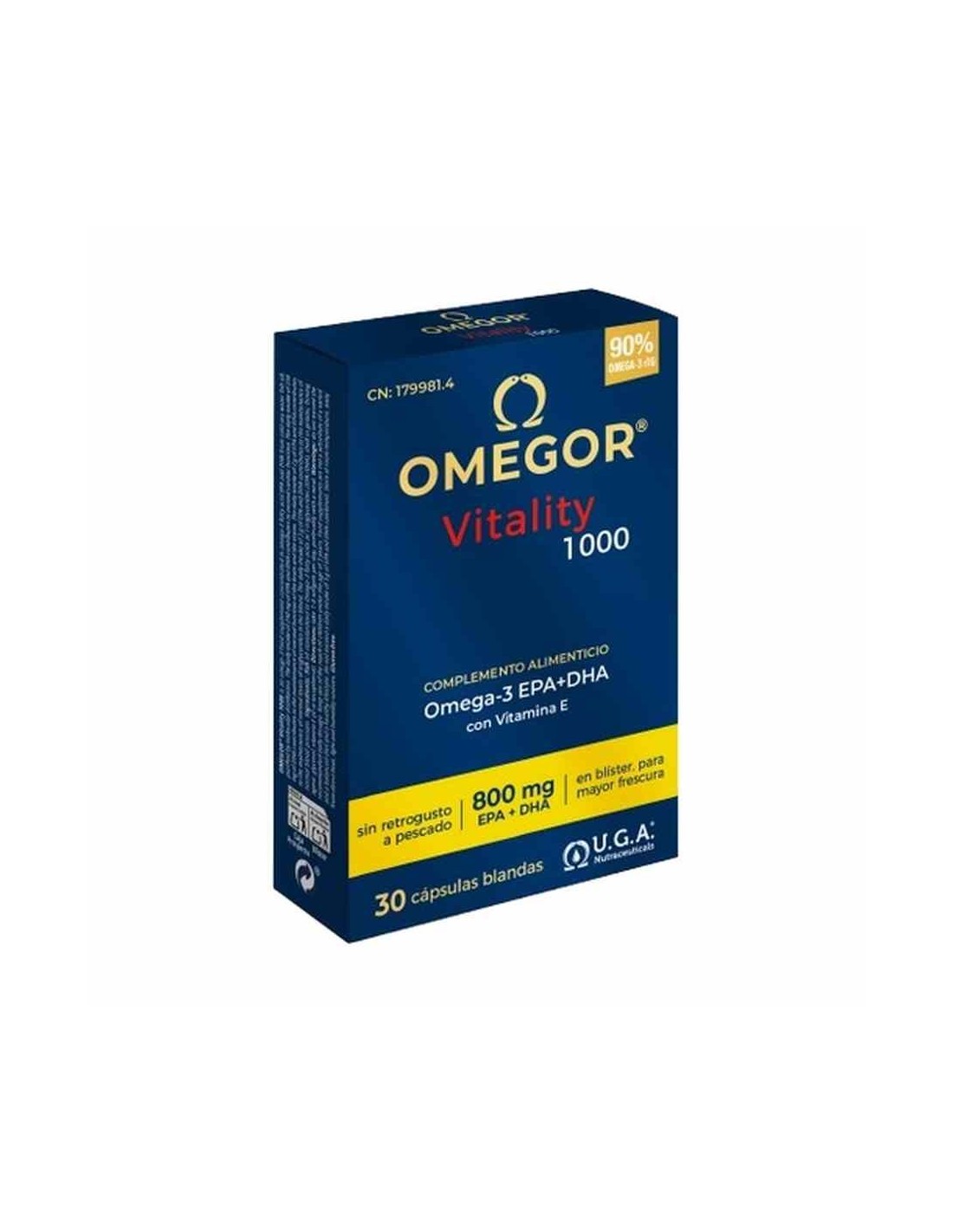 OMEGOR VITALITY 1000 es un complemento alimenticio de omega 3 concentrado en ácidos grasos EPA Y DHA, obtenido de aceite de pescado de aguas frías y purificado mediante destilación molecular. La ingesta diaria de 250mg de EPA y DHA contribuye a la función cardíaca normal. La ingesta diaria d 250mg de EPA y DHA contribuye a mantener la función normal del cerebro y la visión.La ingesta diaria de 2g de EPA y DHA contribuye a mantener niveles normales de triglicéridos .La ingesta de 2mg de EPA y DHA contribuye al mantenimiento de la presión arterial normal.