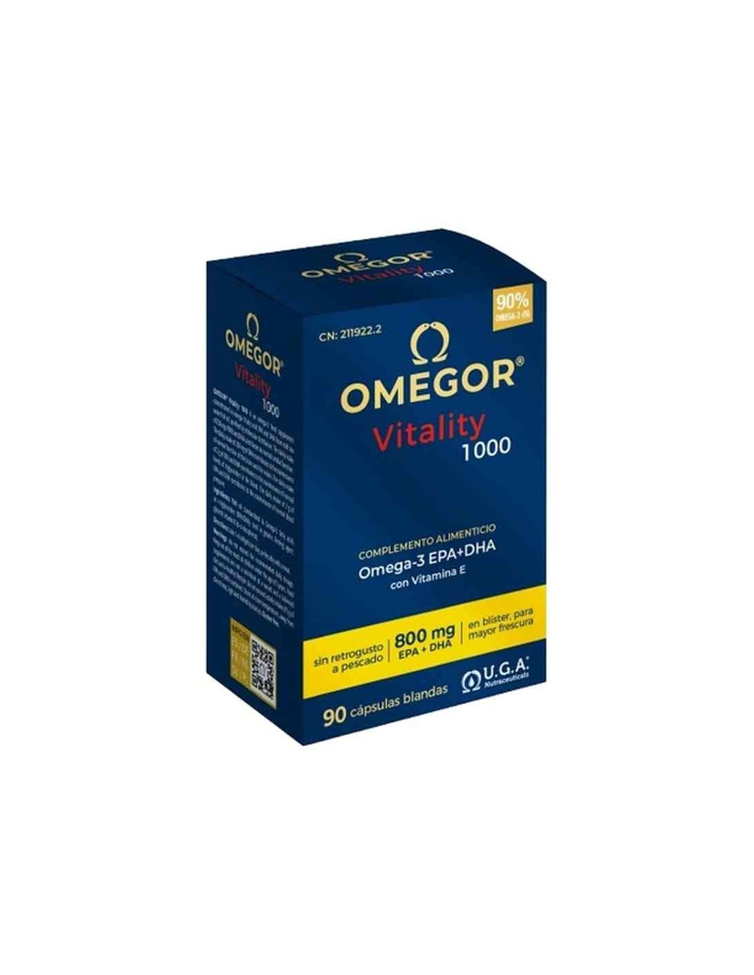 OMEGOR VITALITY 1000 es un complemento alimenticio de omega 3 concentrado en ácidos grasos EPA Y DHA, obtenido de aceite de pescado de aguas frías y purificado mediante destilación molecular. La ingesta diaria de 250mg de EPA y DHA contribuye a la función cardíaca normal. La ingesta diaria d 250mg de EPA y DHA contribuye a mantener la función normal del cerebro y la visión.La ingesta diaria de 2g de EPA y DHA contribuye a mantener niveles normales de triglicéridos .La ingesta de 2mg de EPA y DHA contribuye al mantenimiento de la presión arterial normal.